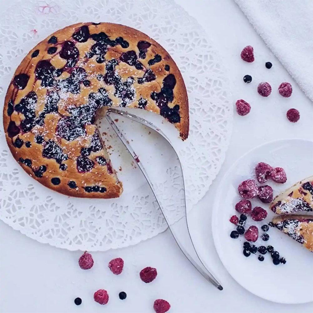 Este porcionador de tortas es mucho más fácil de usar que un servidor de tortas tradicional. Se puede cortar y servir al mismo tiempo. Todo lo que tienes que hacer es simplemente cortarlo empujando hacia abajo desde la parte superior del pastel, apretar ligeramente para sujetar la rebanada y transferir el trozo de pastel a tu plato con facilidad. Solo se necesita un movimiento rápido, sin necesidad de equilibrarlo con un tenedor o un cuchillo.